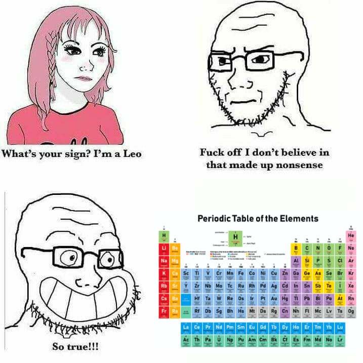 Astrology periodic table meme. Read the signs on the periodic table from the story astrology aesthetics by lethologicals aurelia with 1 068 reads. For an instance you might begin your life at element 16 sulphur or 29 cuprum copper or 82 plumbum lead. Jul 17 2015 explore brigitteball s board astrology zodiac charts on pinterest. Vedic astrology periodic table words periotic table horses. May 24 2020 explore gurudutta s board astrology on pinterest. Dec 22 2019 explore suzyknuckles s board astrology calendar on pinterest. The signs on the periodic table the times of day the signs as 2015 memes pt 1 sponge bob time cards fix yourself when.