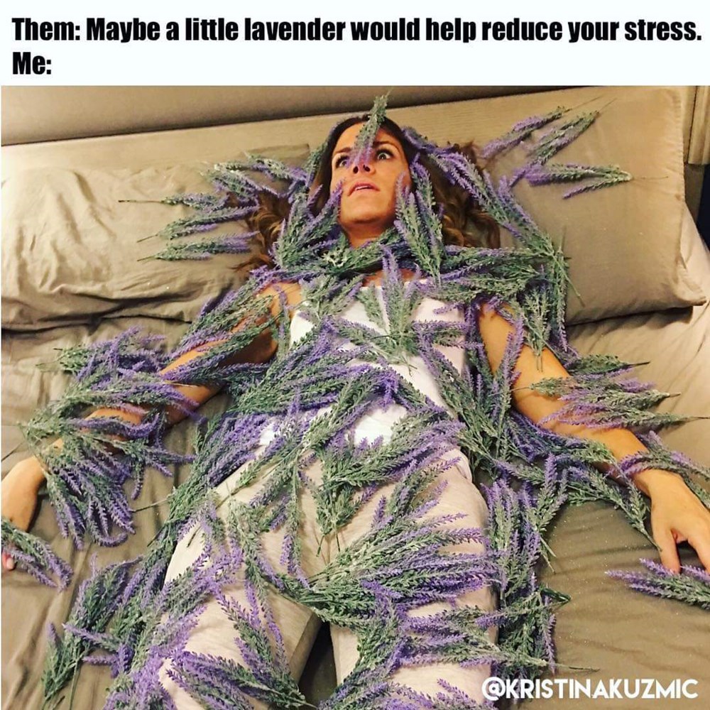 Lavender aromatherapy is great for reducing stress. Lavender was used in the treatment of anxiety disorders and related conditions. One simply does now run out of lavender if they got kids. There s also some evidence that ingesting lavender oil may help relieve anxiety. Overview information lavender is an herb. 40 funny quarantine memes to help relieve stress as people around the country continue sheltering in place during the coronavirus pandemic here s a collection of the funniest memes and tweets to make you feel less stressed during quarantine. Honey lavender meme duration.