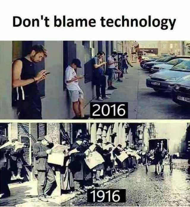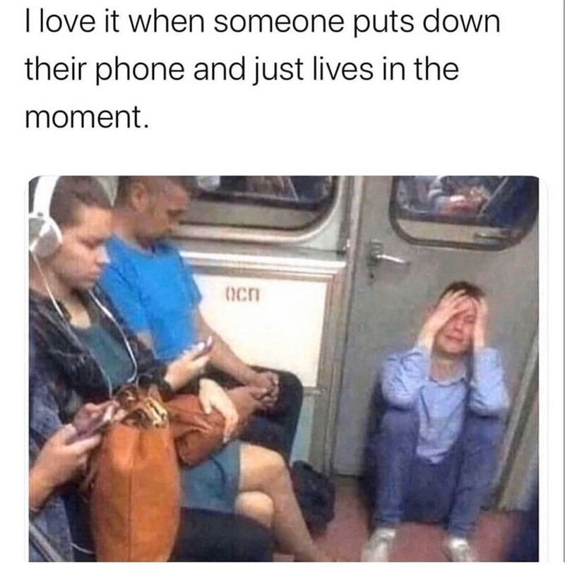 All you need to do is think of a film still or tv scene or iconic vine without cell phones and then accompany it with the line not a cell phone in sight.