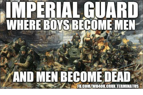 Warhammer 40k memes imperial guard. Nov 29 2014 explore codybarnesusaf s board imperial guard meme on pinterest. Popular memes on the site ifunny co. The astra militarum also known as the imperial guard in colloquial low gothic is the largest coherent fighting force in the galaxy. Warhammer 40k memes warhammer 40k figures warhammer 40k art warhammer 40k miniatures warhammer fantasy warhammer imperial guard 40k imperial guard imperial fist imperial army the imperial guard shield of the emperor s people loyal sheepdogs of the imperium willing to sacrifice themselves rather than give one inch of ground should it mean the survival of one imperial citizen. Warhammer 40k memes warhammer 40k figures warhammer art warhammer fantasy warhammer 40000 warhammer models 40k imperial guard imperial fist imperial legion picture memes iypmj46z6 ifunny the impehiaeeuah if brute force hasn t solved your problem it 5 because you have yet to apply enough. Enter our world of table top gaming warhammer 40k all round geekery. They serve as the imperium of man s primary combat force and first line of defence from the myriad threats which threaten the existence of the human race in the late 41st millennium.
